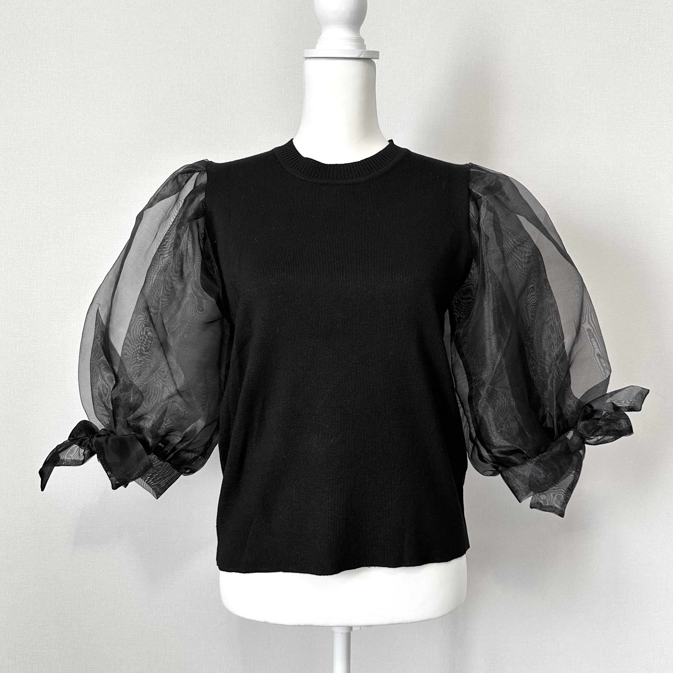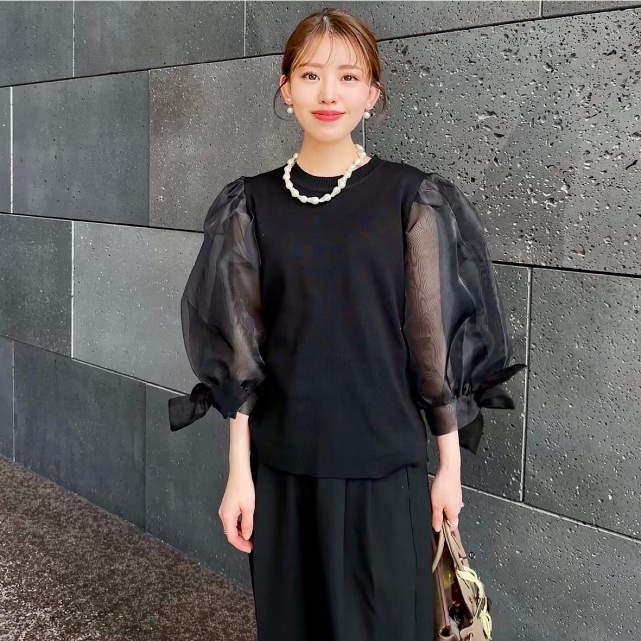 ふわっと柔らかなニットにチュールをドッキングさせたエアリー感ある春らしいトップス。