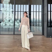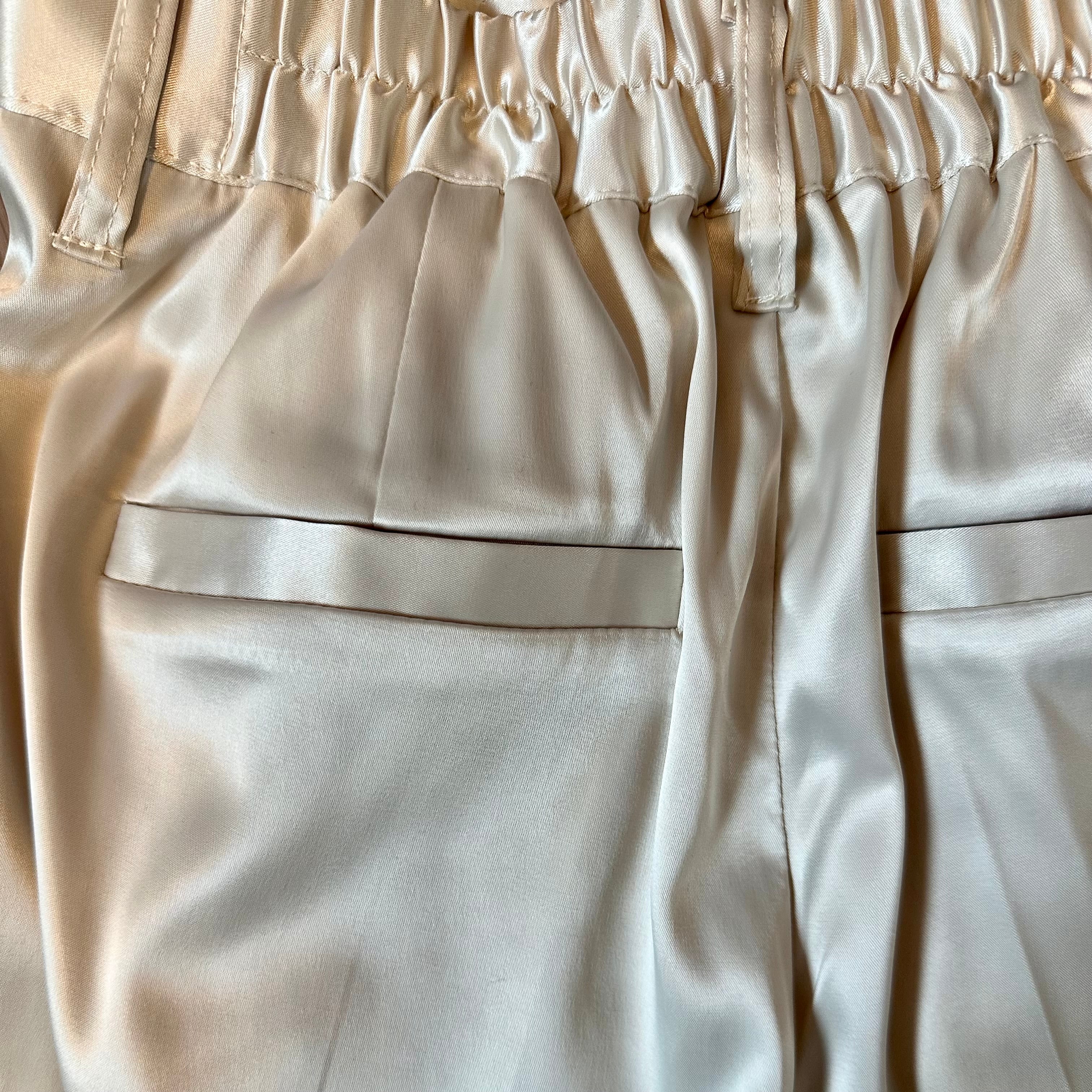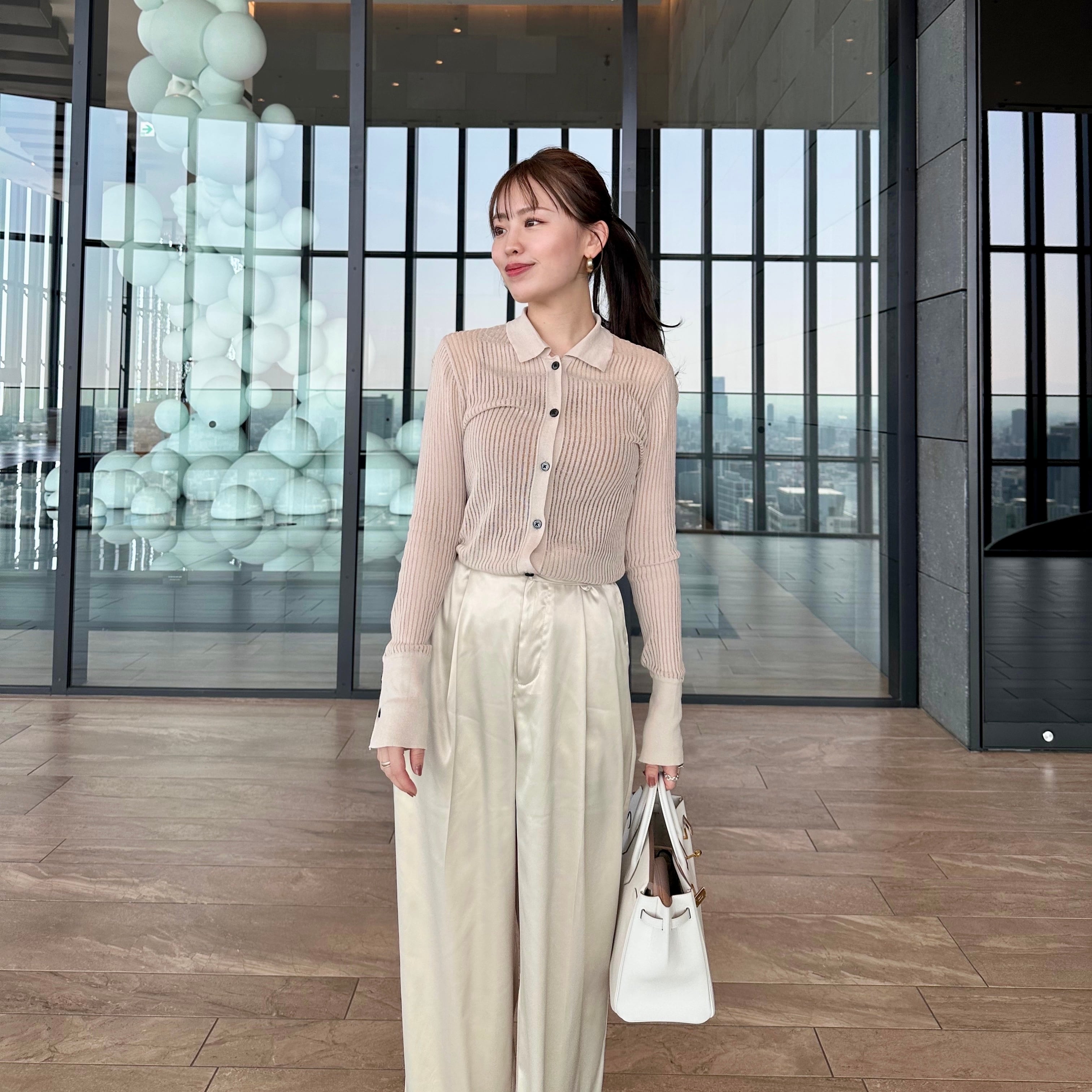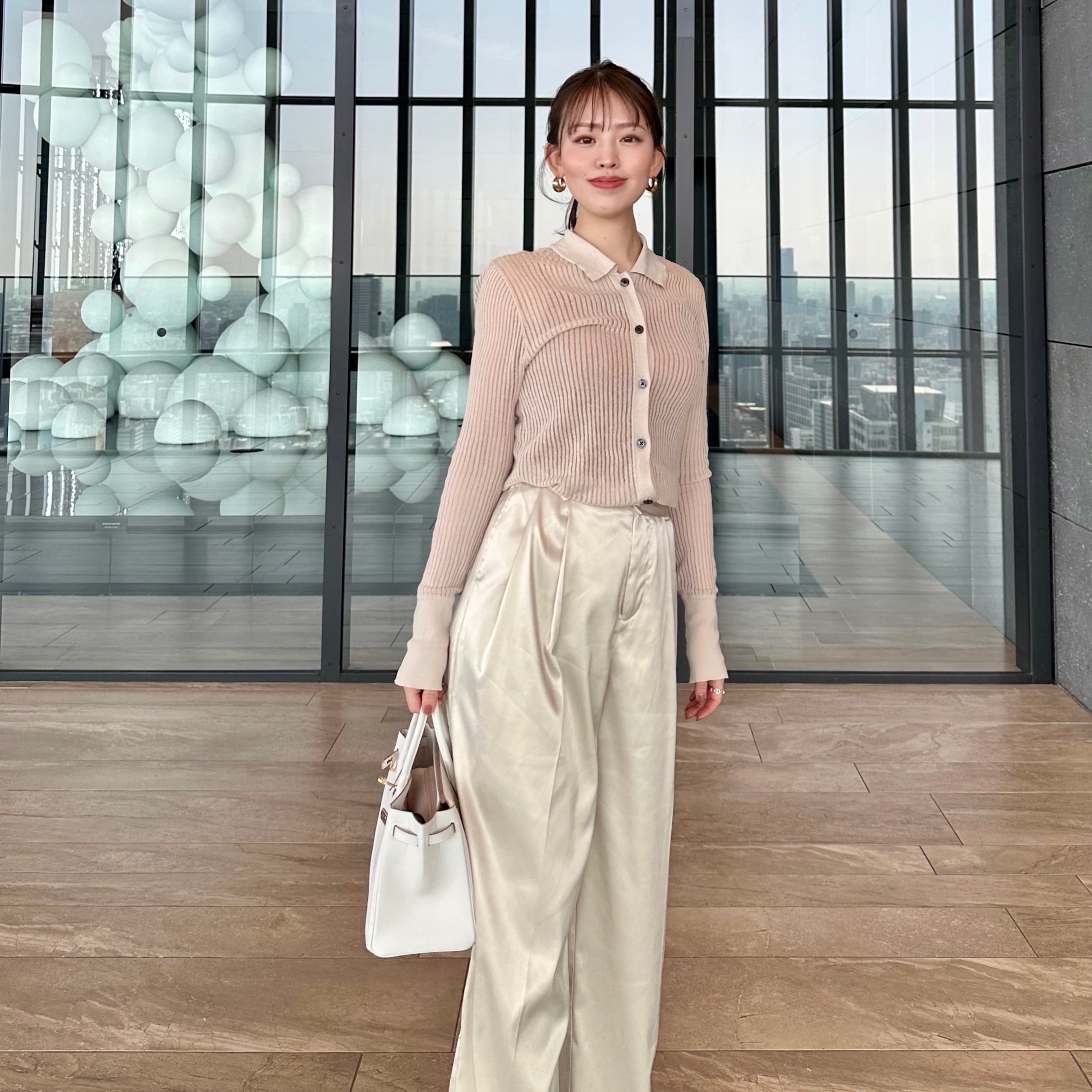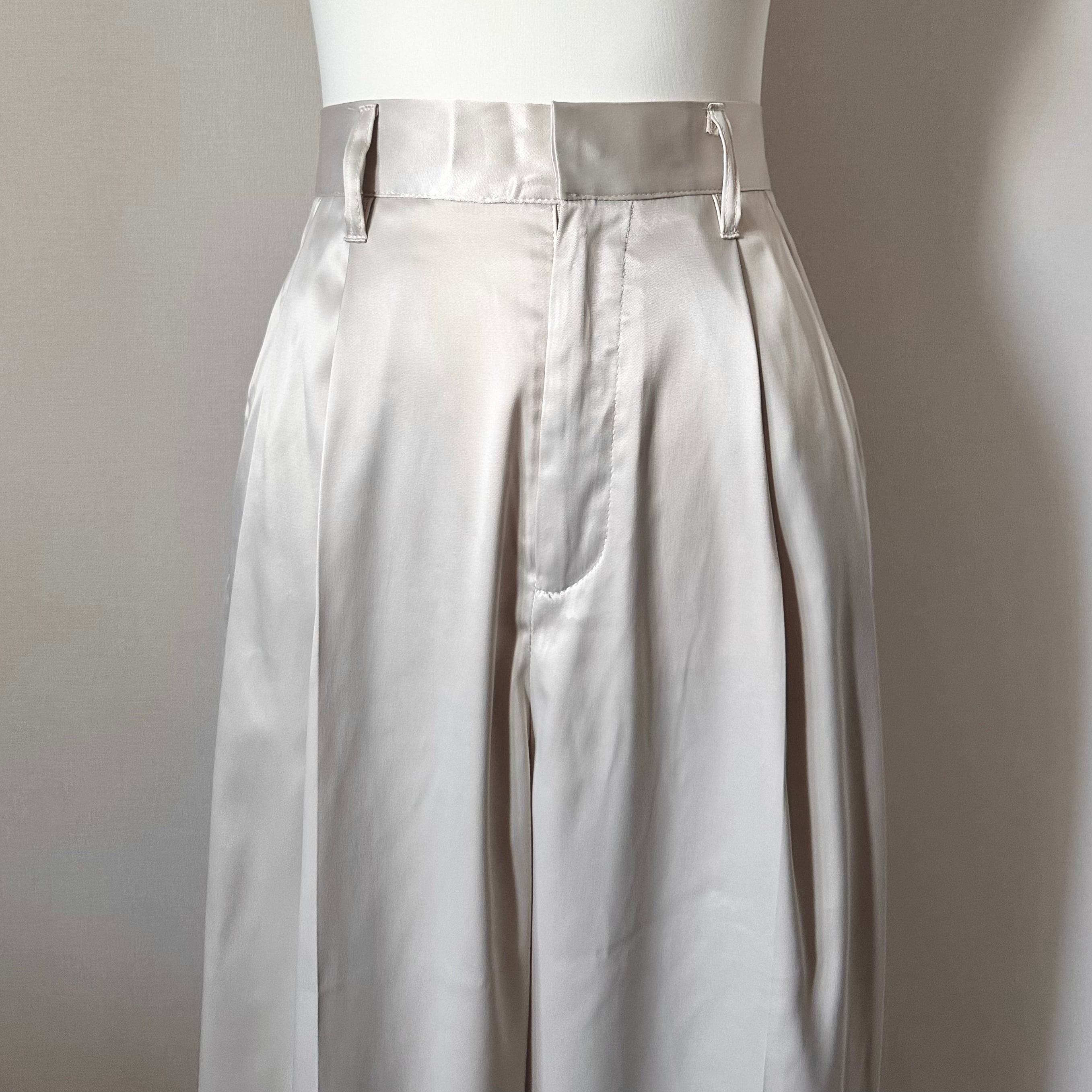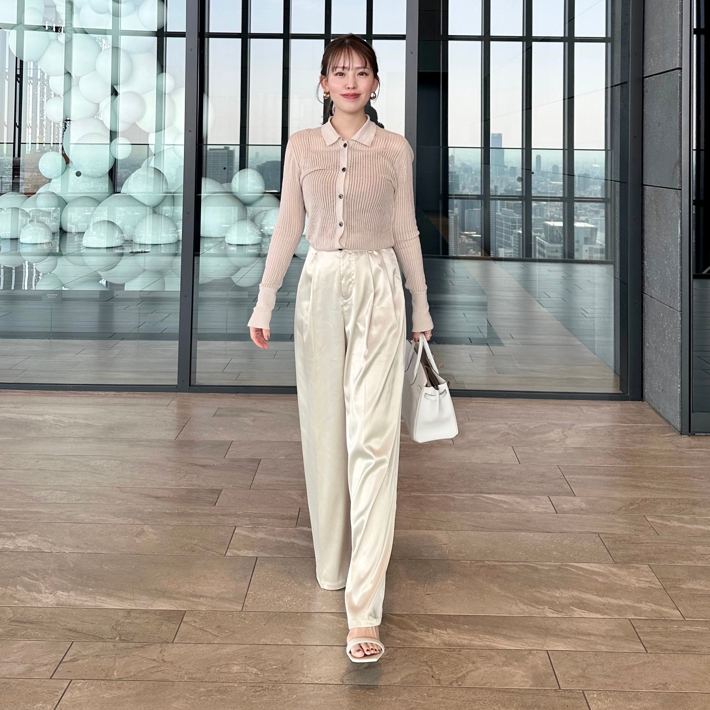 華やかさを演出してくれる上品な光沢のワイドパンツ。