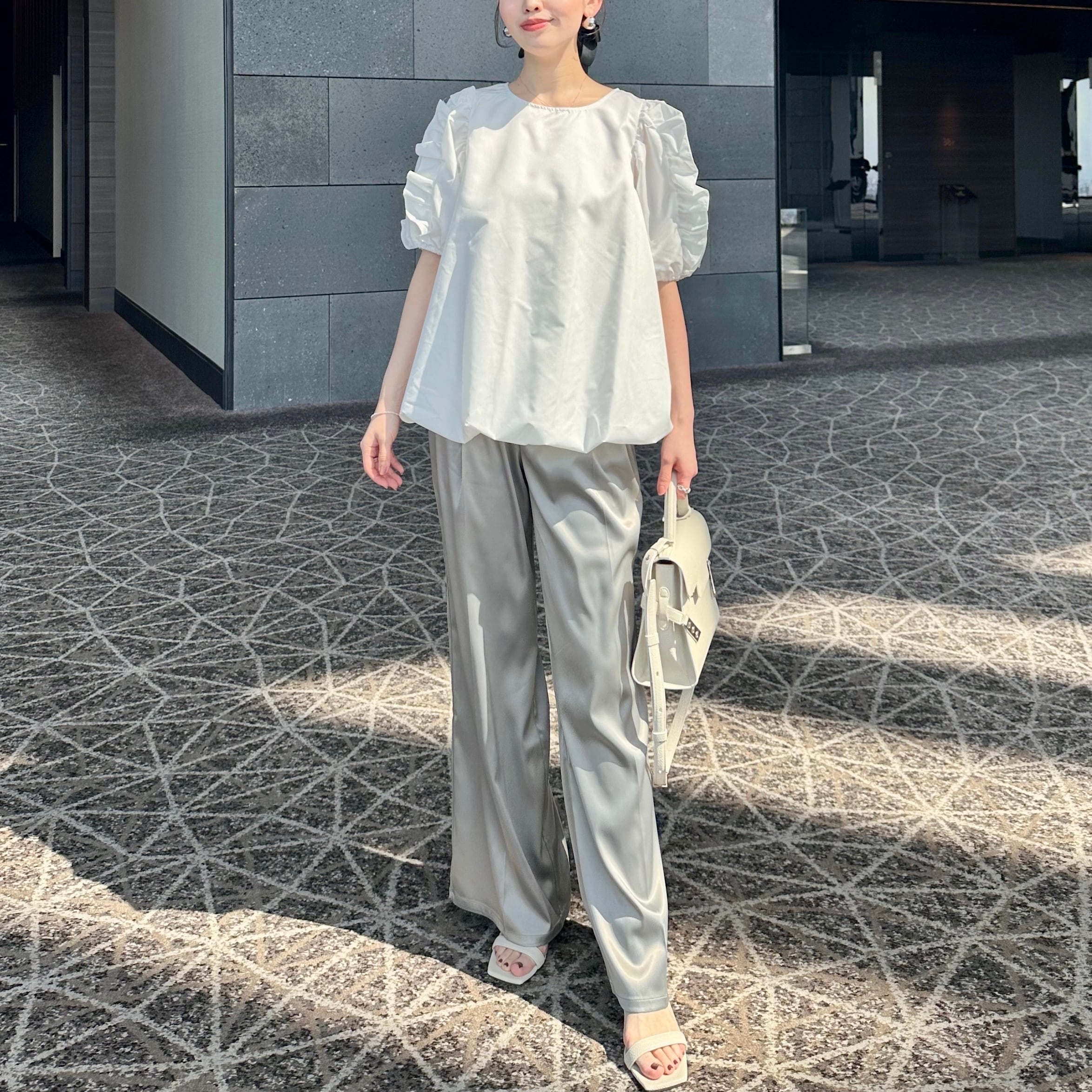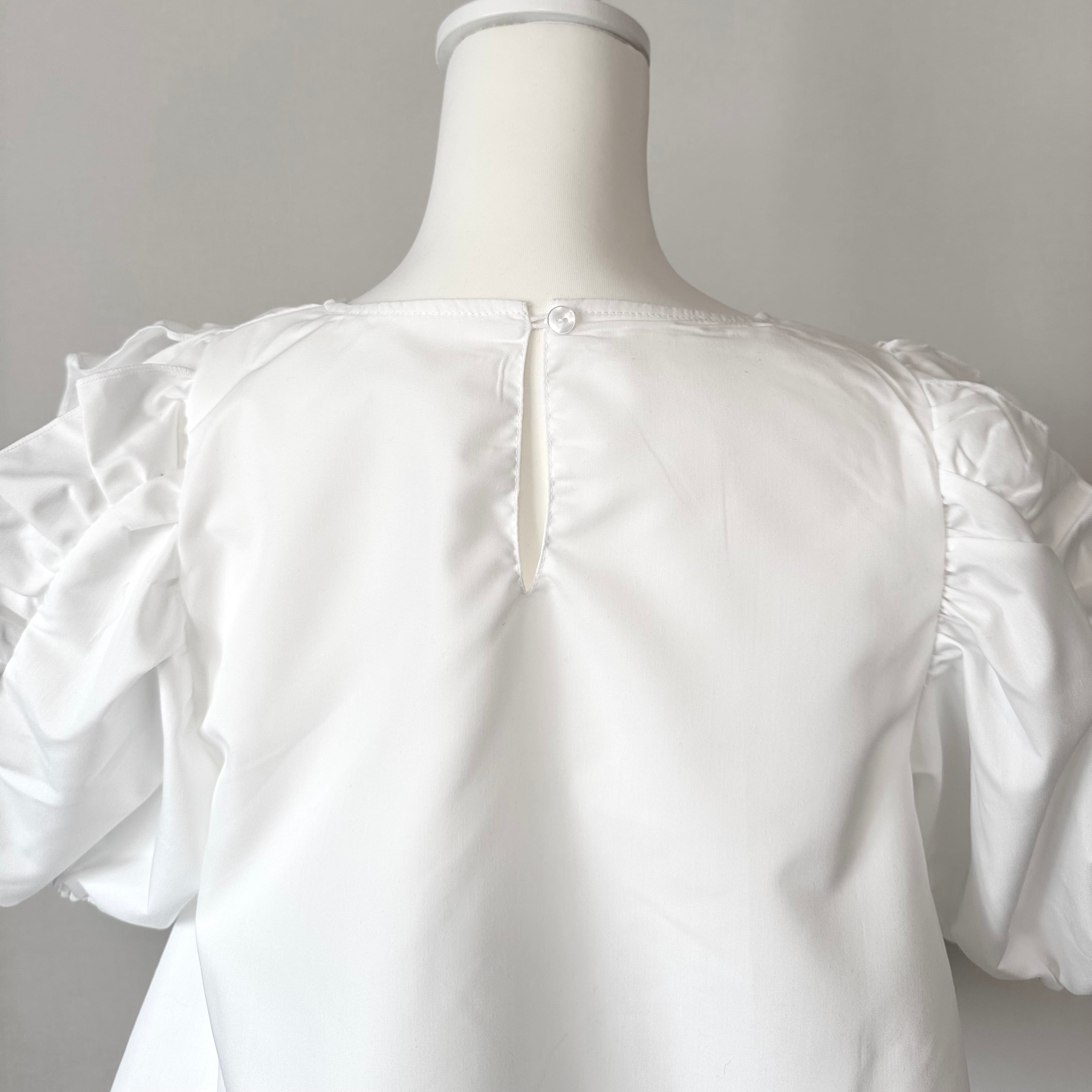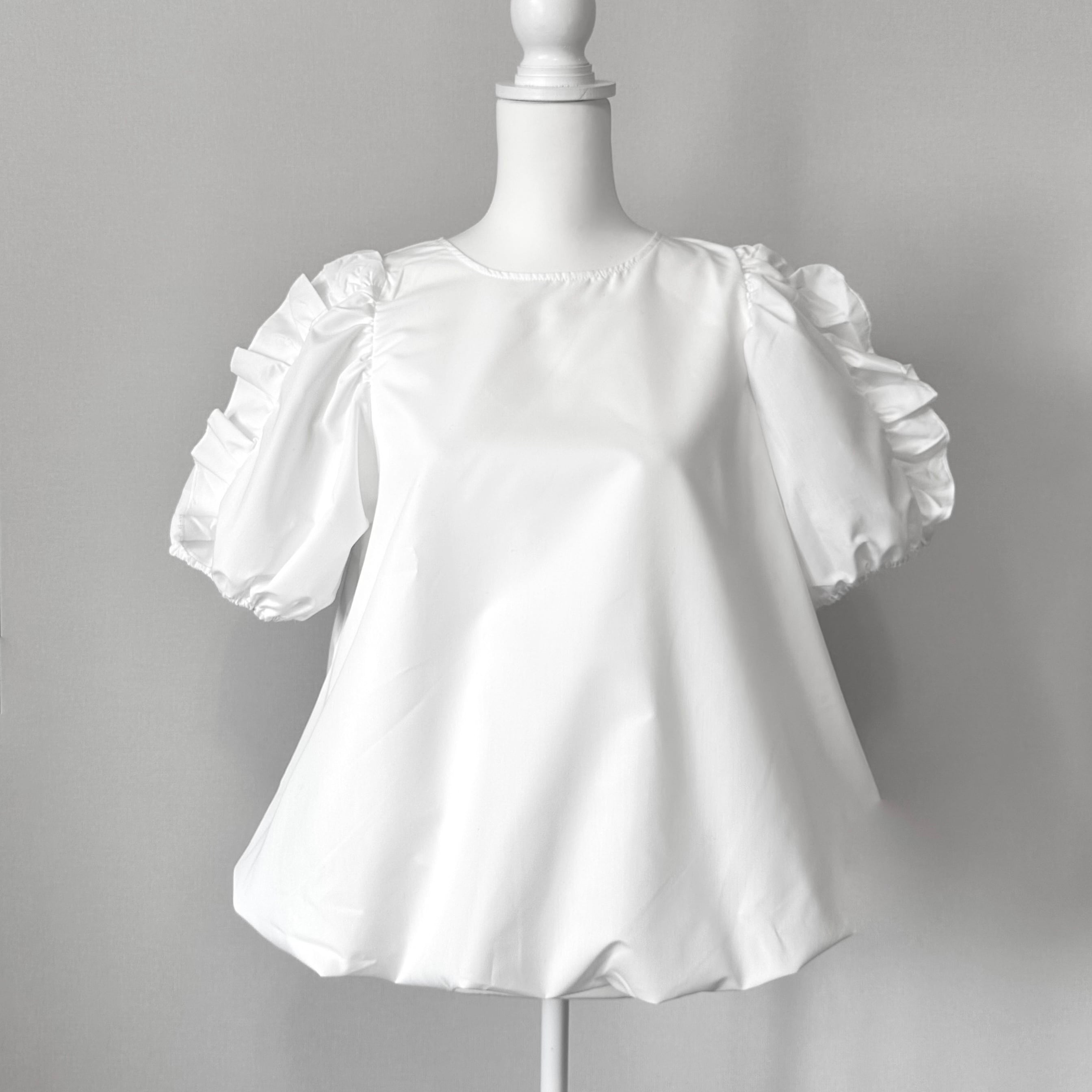 お袖のフリルデザインと 愛らしく膨らむ裾バルーンは360度どこから見ても完璧なブラウス。