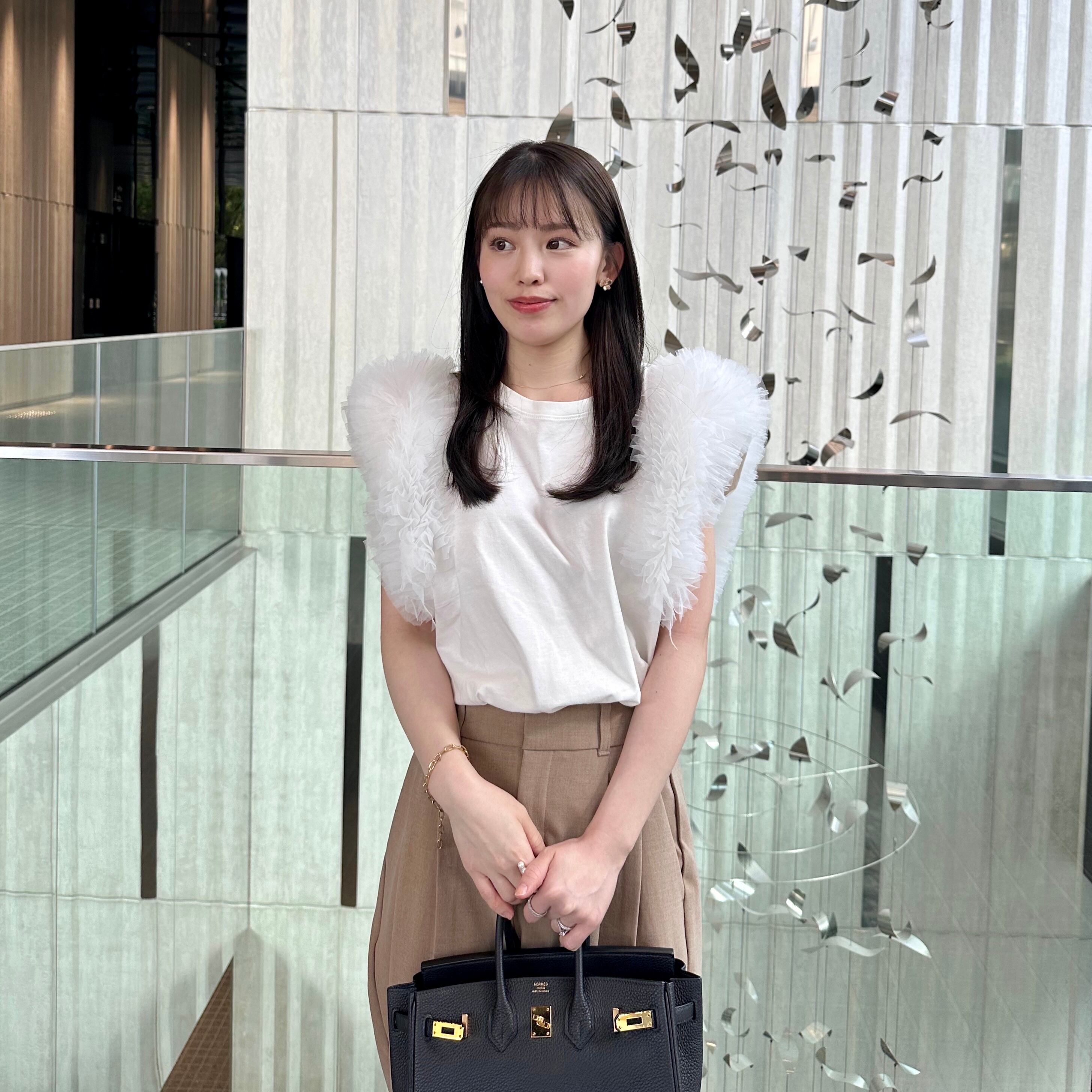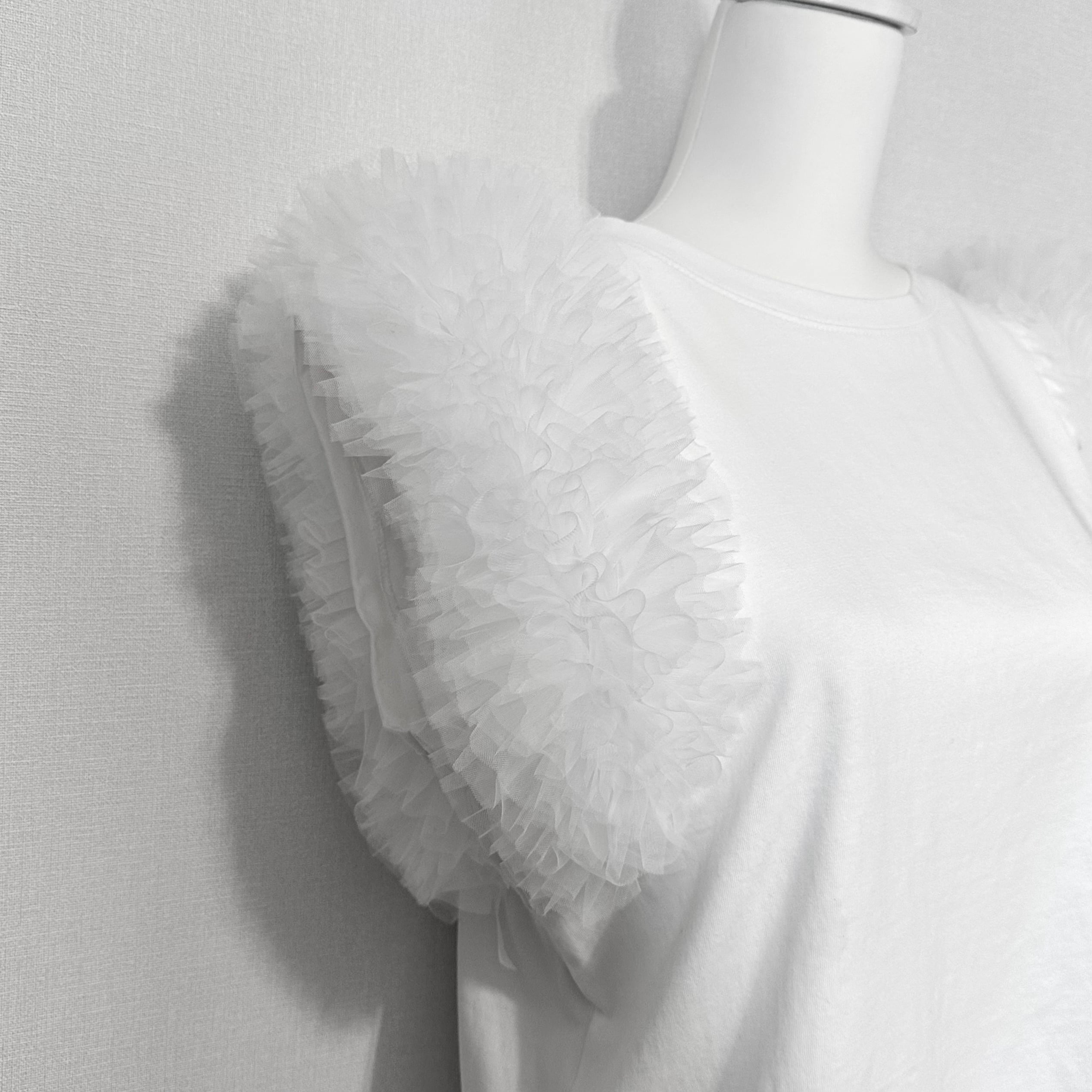 ふわっとしたボリューミーなチュール素材が袖口に重ねられ、立体的で華やかな印象を与えます。