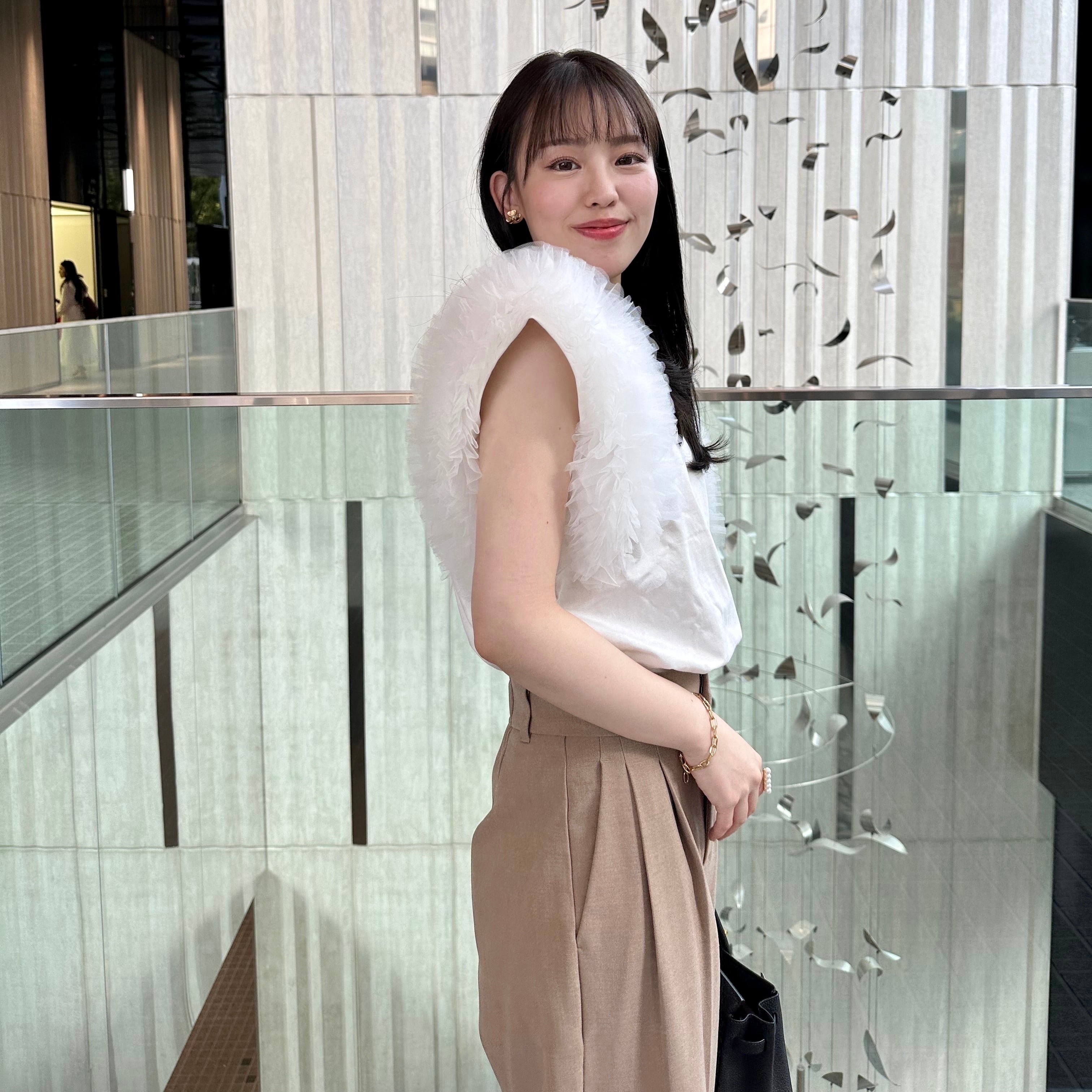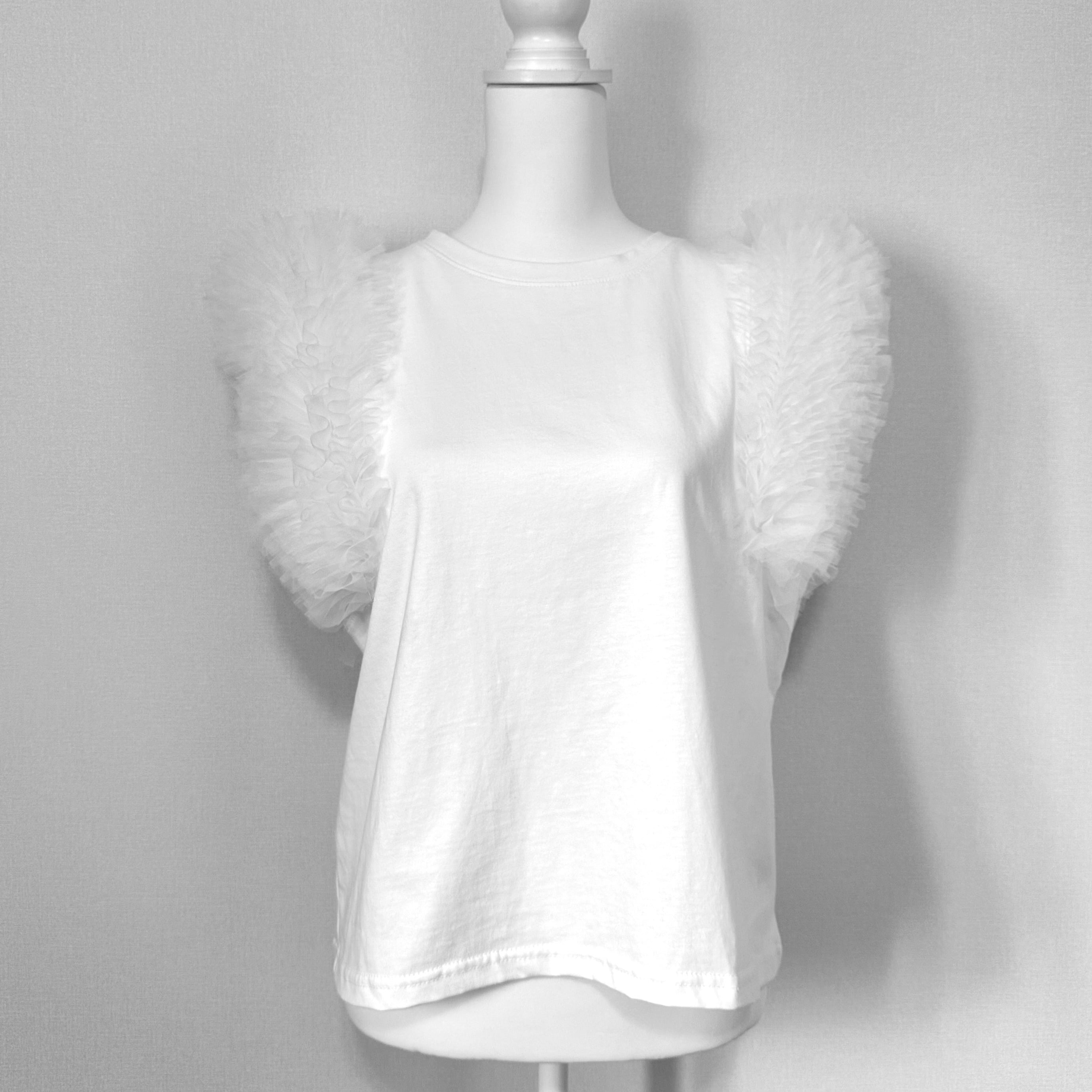繊細なチュールフリルが施された、フェミニンさ際立つデザインのトップス。