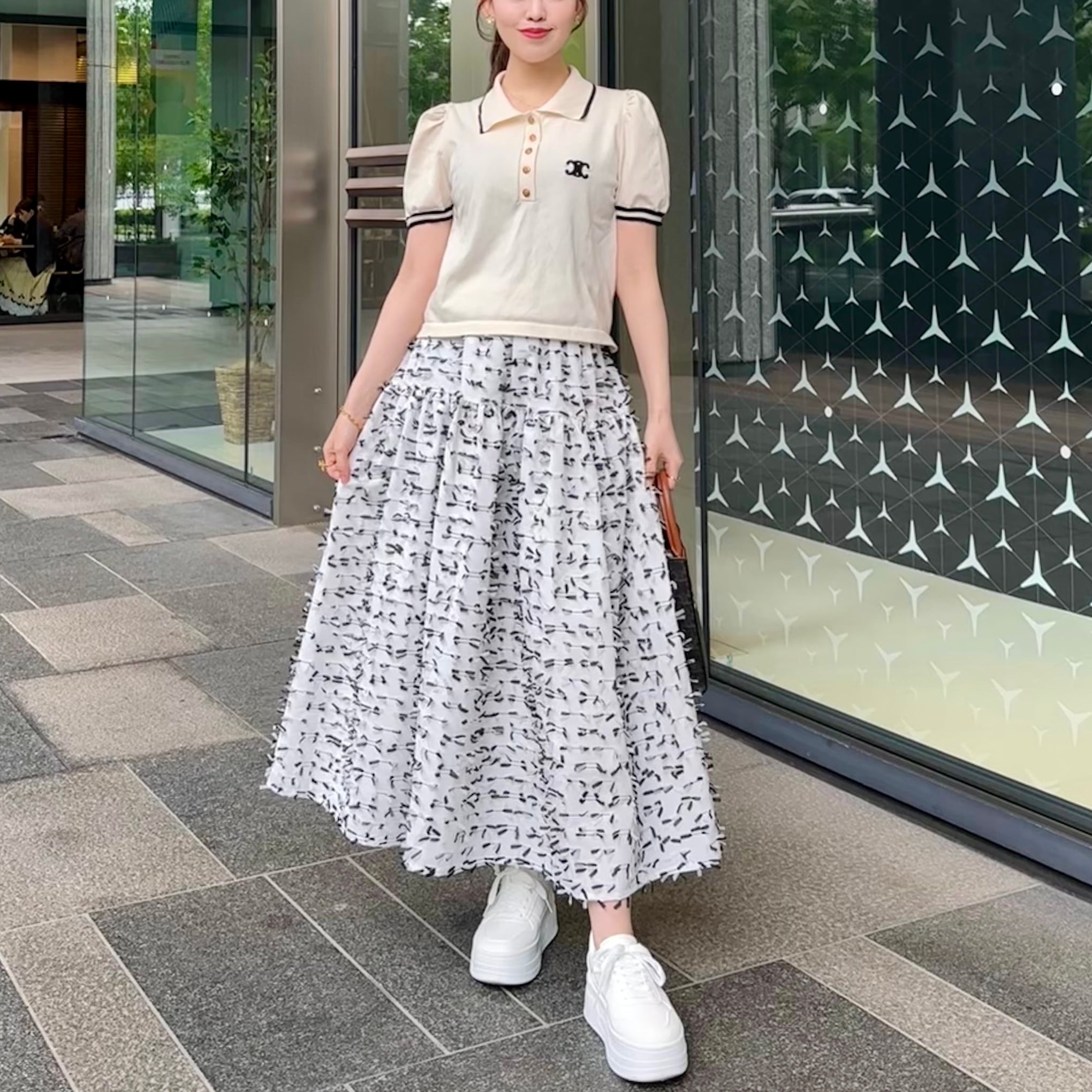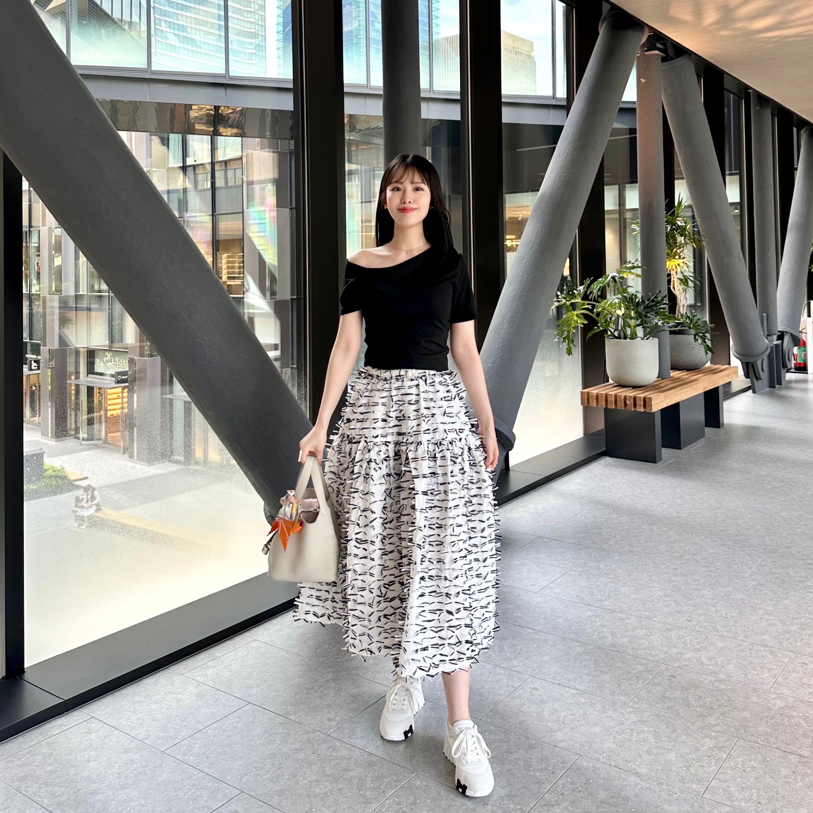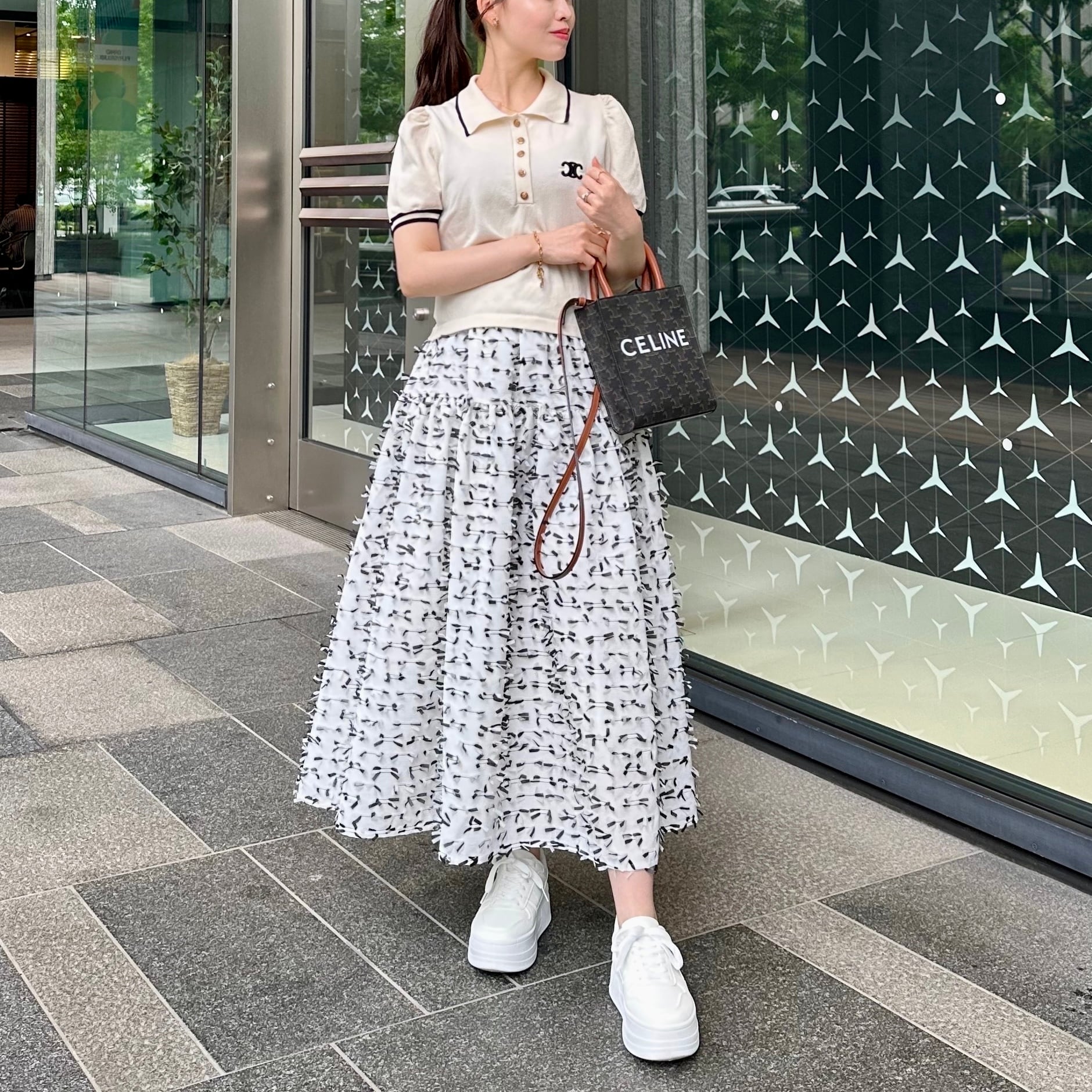 立体感のあるシルエットがコーデの主役になり、シンプルなトップス合わせでも華やかなスタイリングが完成する、この夏必見の1枚です。