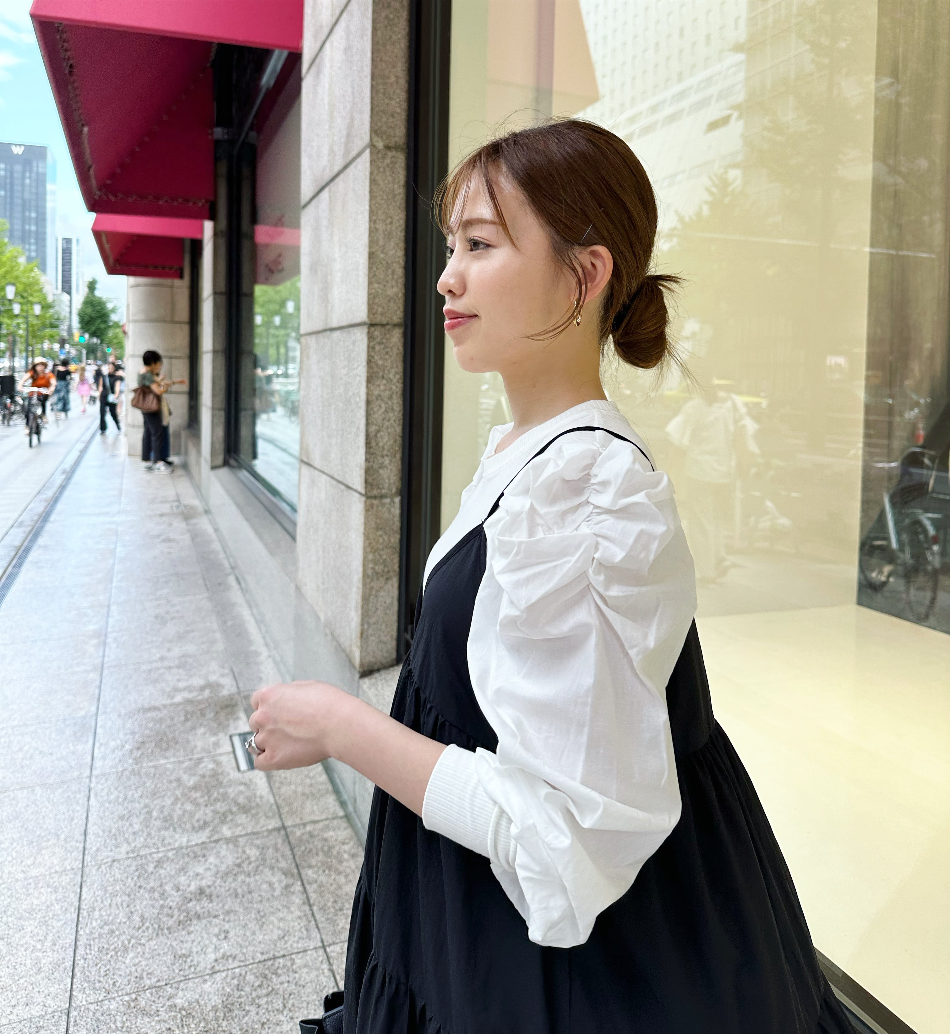 グッとトレンド感が増す、シャツ素材とカットソー素材のドッキングトップス。