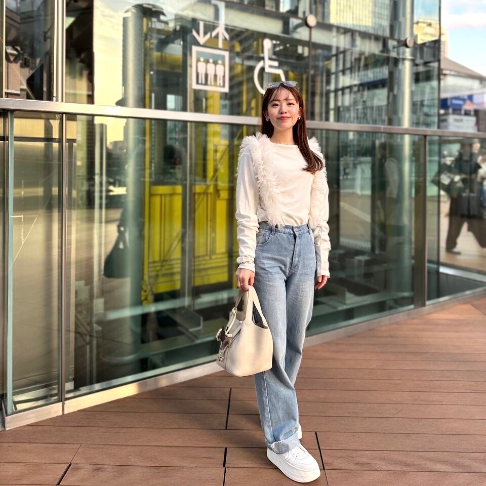 トレンドのルーズシルエットですが、すっきりとしたラインで美脚効果も◎