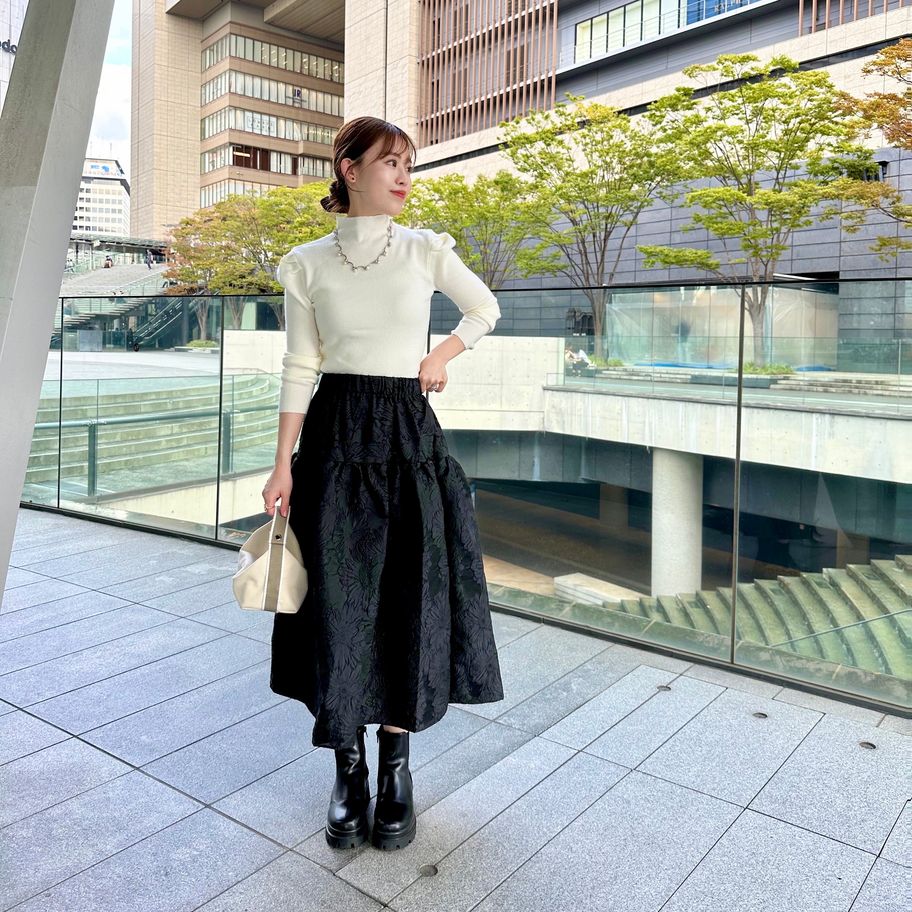 女性らしさを引き立てる華やかなフラワージャガードデザインのスカートは今季マストアイテム。