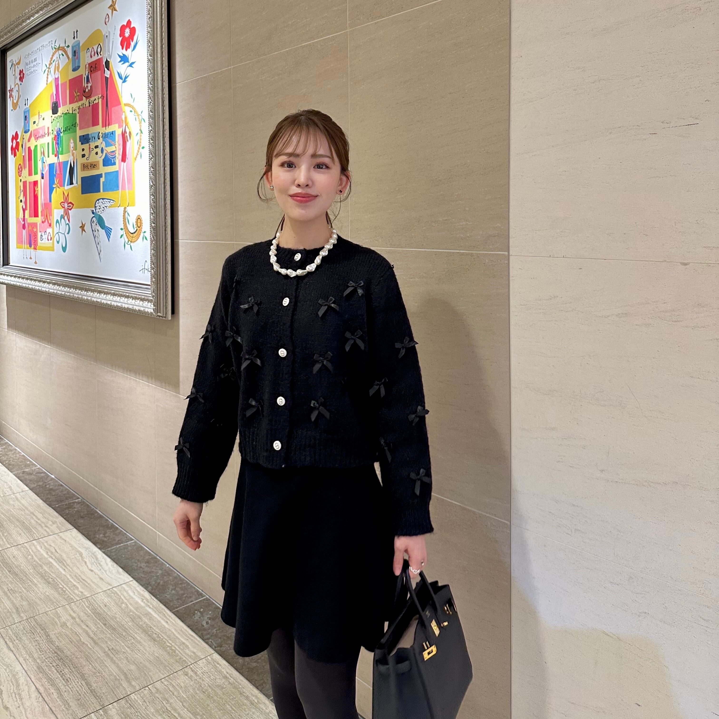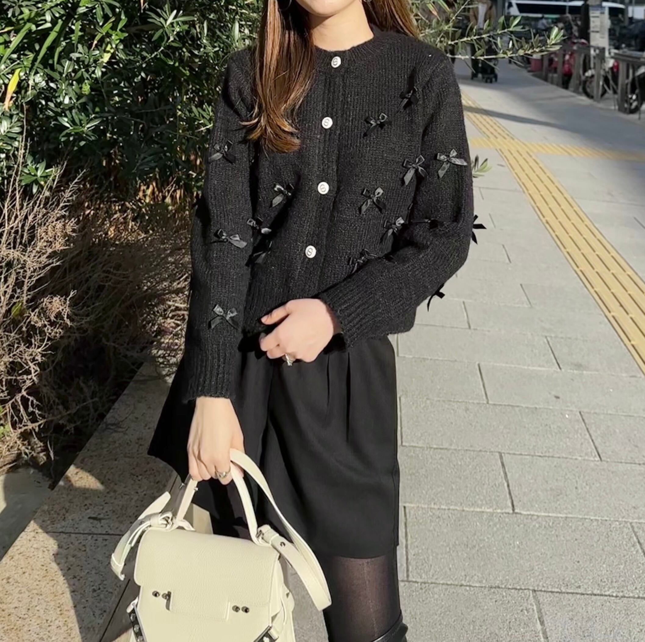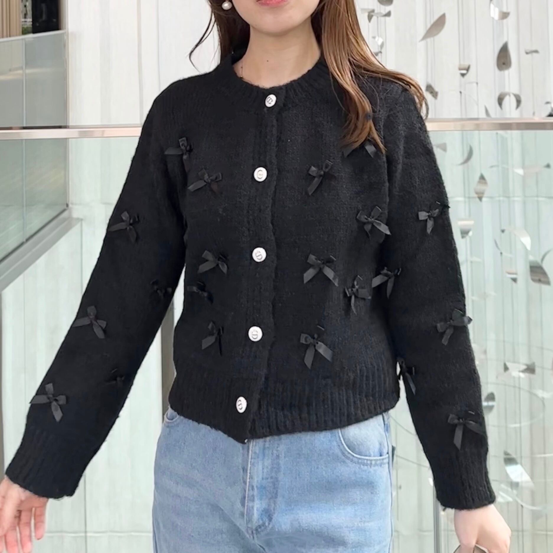 散りばめられたリボンがフェミニンな雰囲気をぐっと引き立ててくれるニットカーディガン。