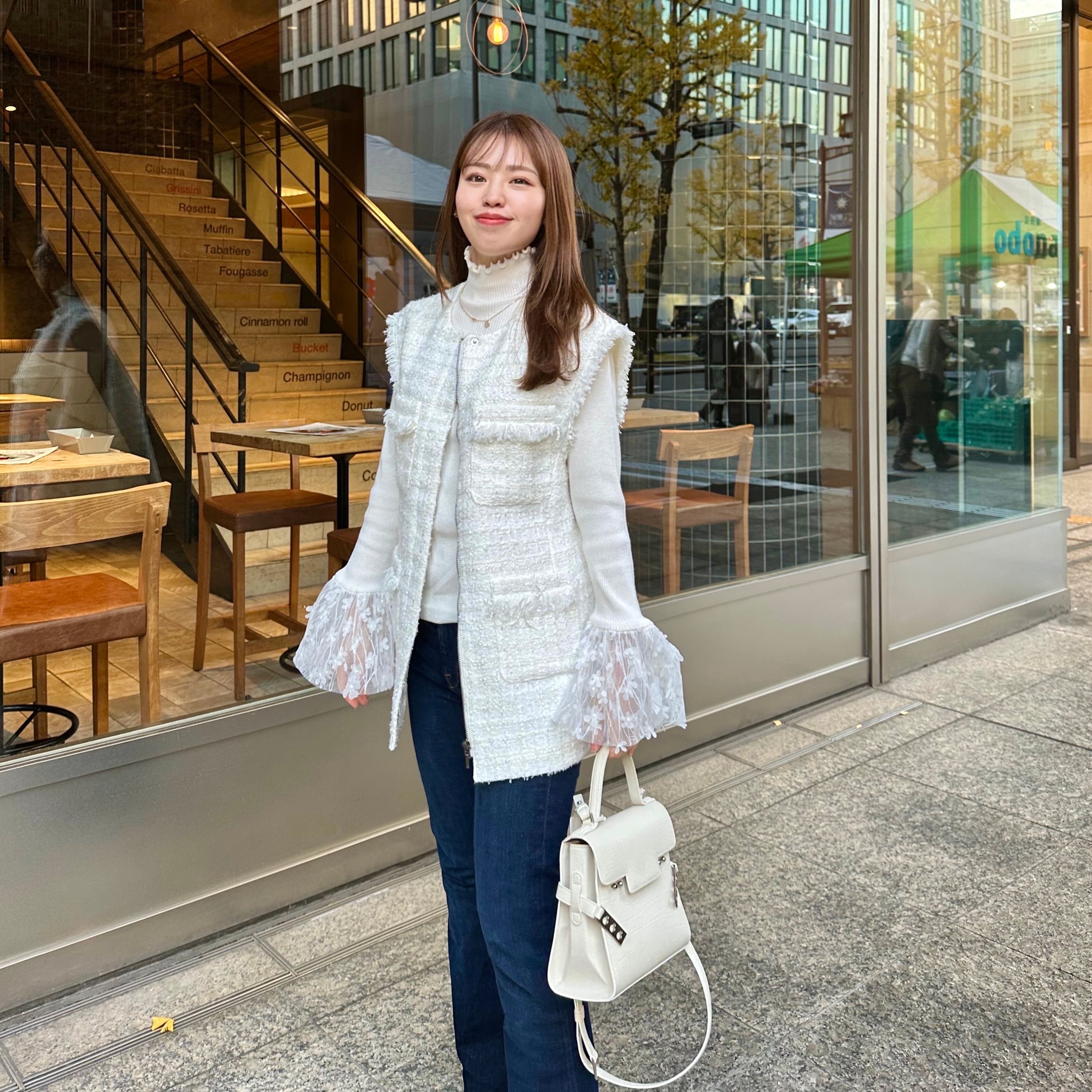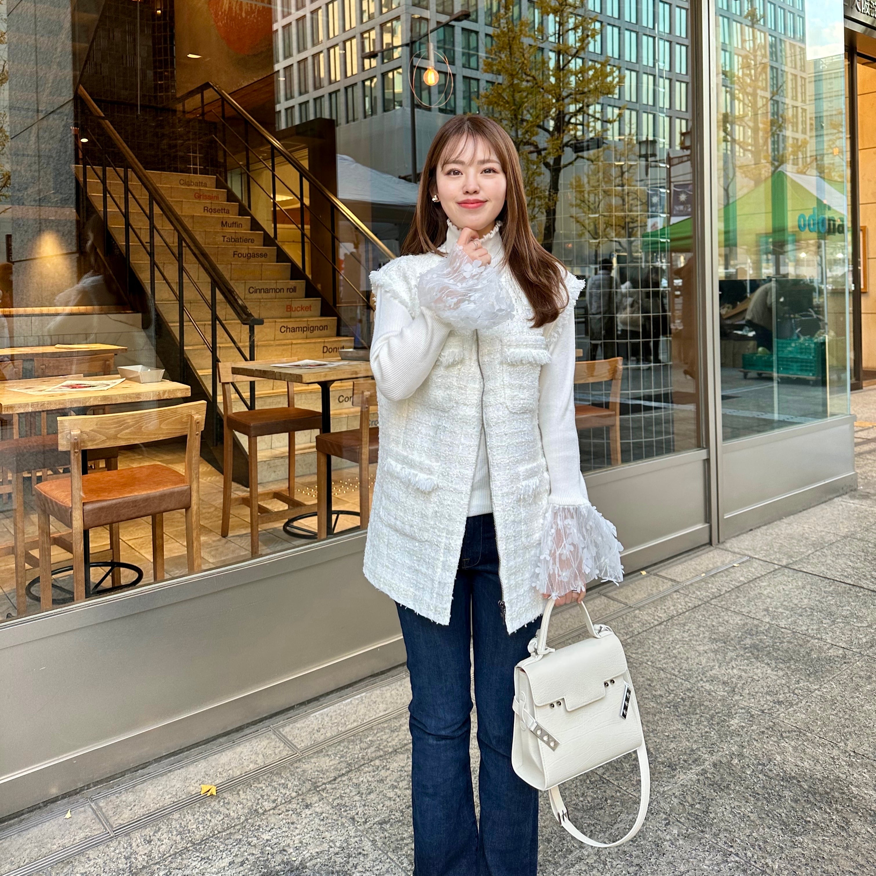 一枚で着るのはもちろん、カーディガンのインナーにして袖口からベルスリーブを出すスタイリングもおすすめです。