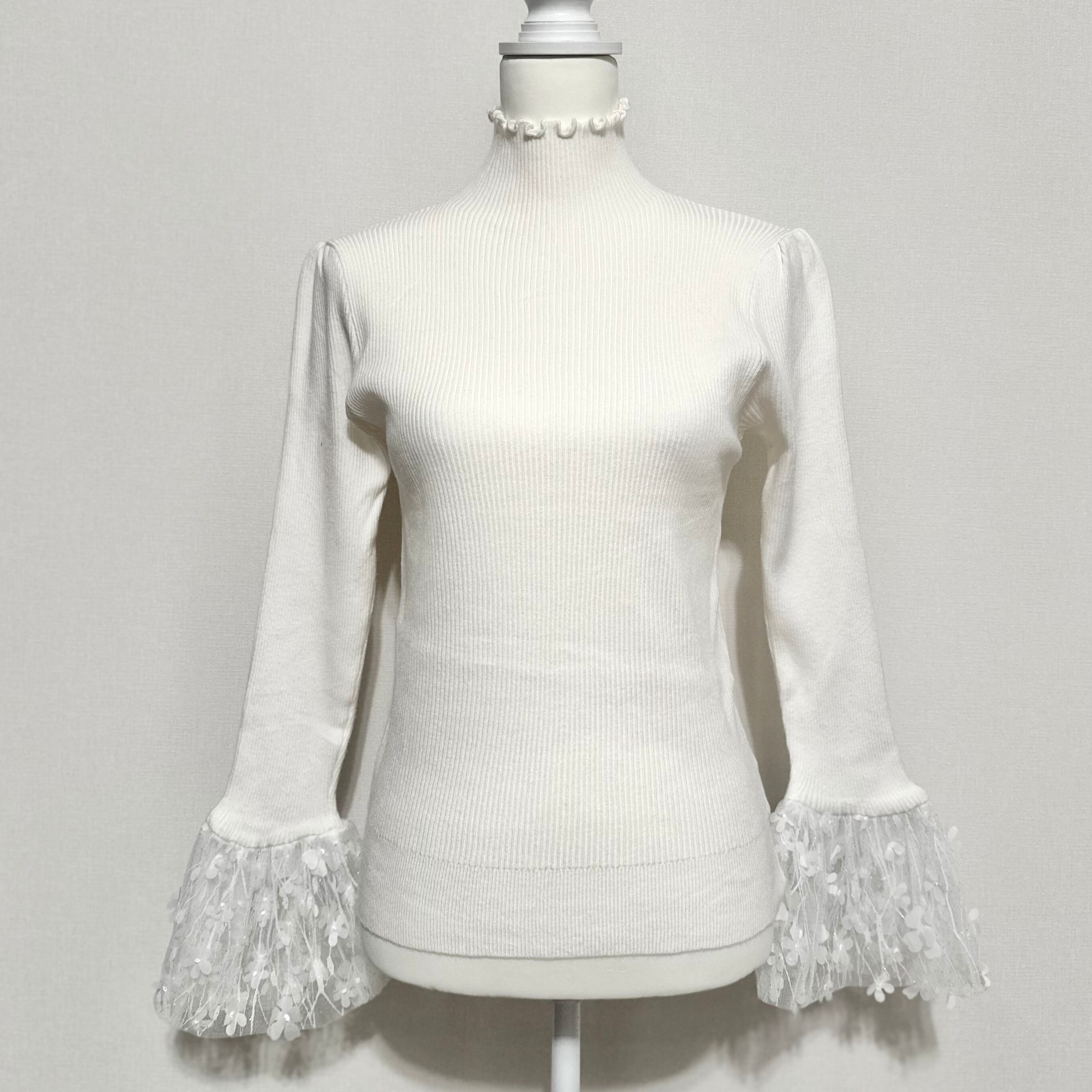 ランダムに散りばめられた立体的なフラワーデザインが特別感を演出するニット。